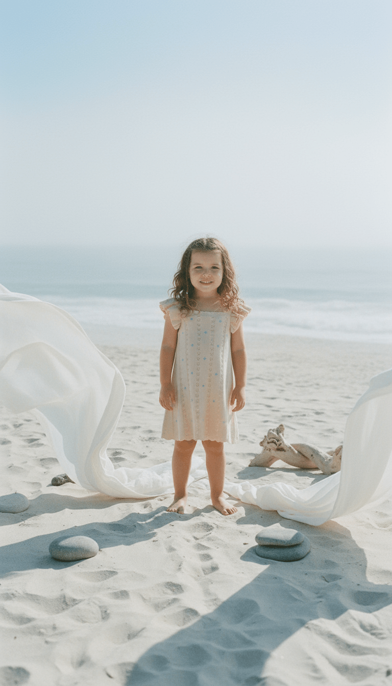 Designed in house our exclusive shell knit pointelle nods to the delicate beauty of seashells, adorned with tiny, embroidered light blue flowers. While her whimsical ruffled shoulders and scalloped edging is the perfect mix of charm and effortlessness.